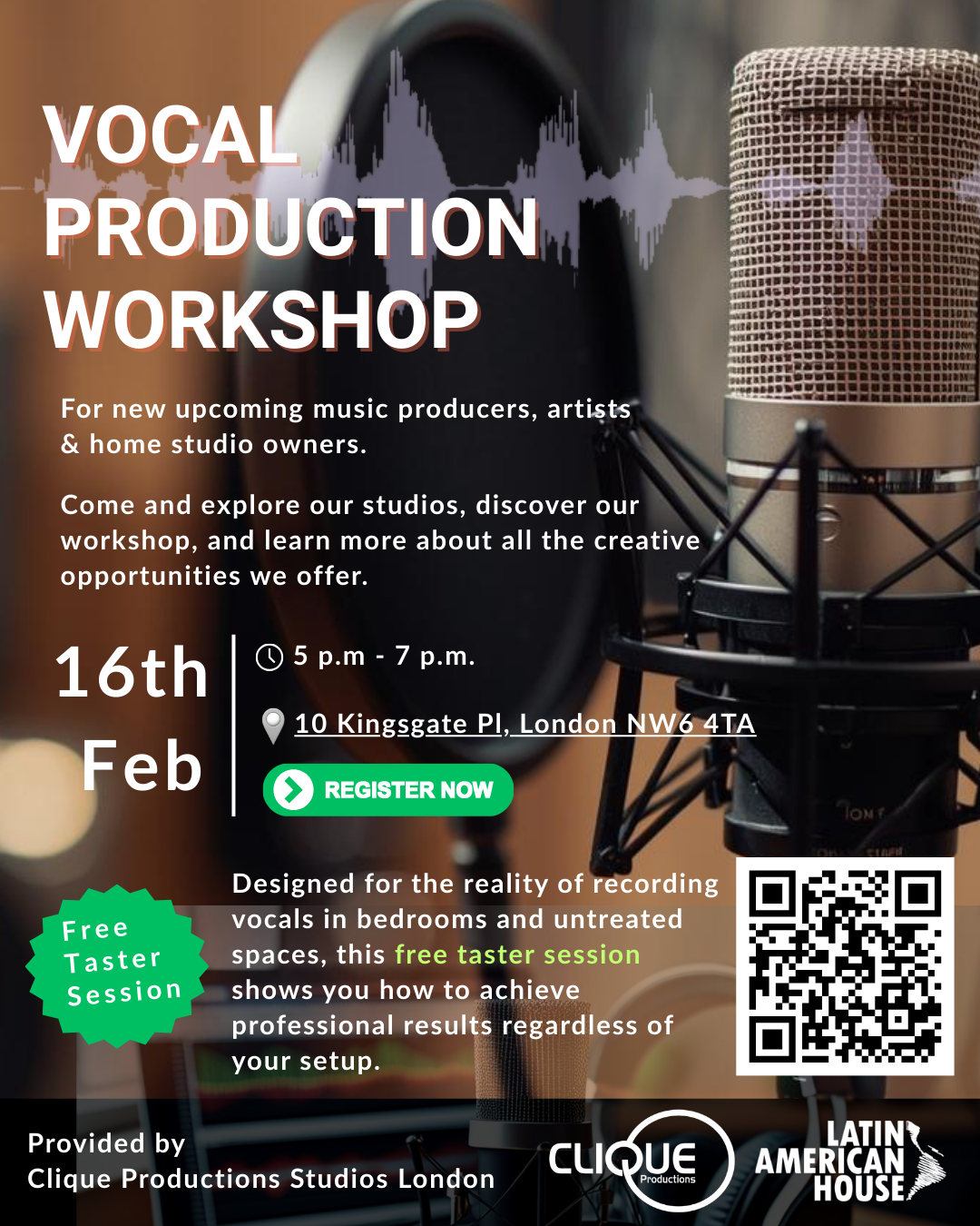 Hands-on workshop delivered in partnership with Clique Productions Ltd. Learn techniques for vocal performance and production.